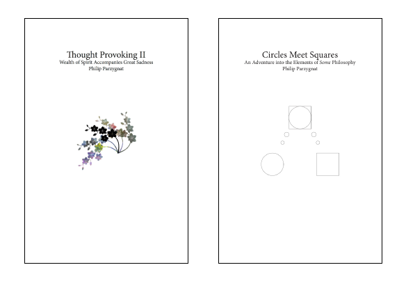 I am happy to announce that I have two new books in progress. Both works are in the spirit of many of my other endeavors into philosophy by way of concise prose and distinct idea. Thought Provoking II and Circles meet Squares are both coming along and may be available for purchase as soon as December 2018. Until then please shop Philip Parzygnat via Barnes and Noble Online, Apple iBooks, or Amazon. See the Complete menu item for more details.